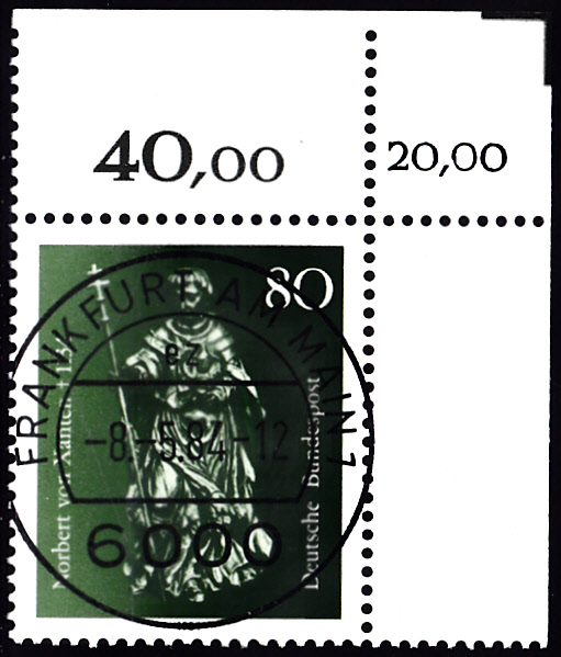 Auch dieses Eckrandstück der Marke "850. Todestag des hl. Norbert von Xanten" hat einen korrigierten Bogenwertzähler und einen zusätzlichen Schneidewinkel.