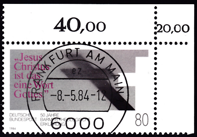 Es geht weiter mit der Marke "50 Jahre Barmer Theologische Erklärung" mit einem korrigierten Bogenwertzähler.