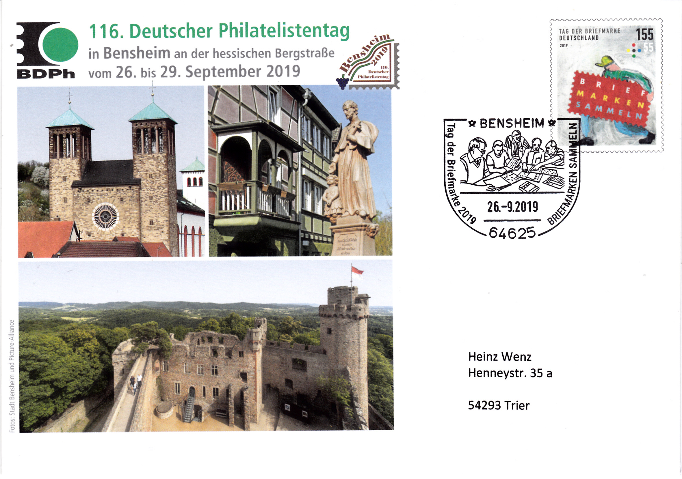 Zu dieser Ganzsache passt natürlich auch der Sonderstempel zum Tag der Briefmarke vom 26.9.2019 aus Bensheim.