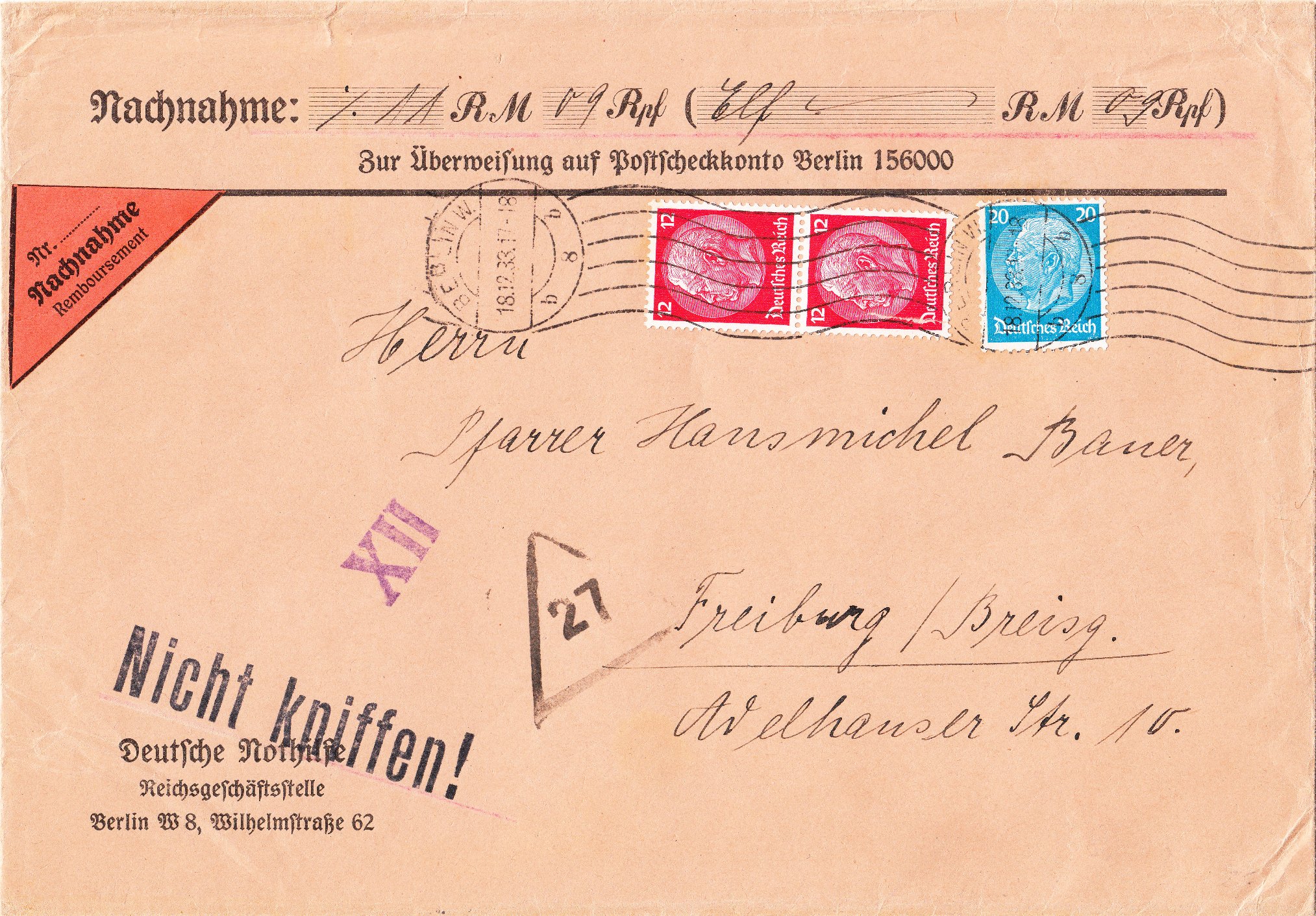 Die zwei Stempel "XII" in Violett sowie "27" in Schwarz sind Postlagerstempel. Sie wurden abgeschlagen, nachdem der Beleg sich als nicht sofort zustellbar erwies und der Empfänger daher benachrichtigt wurde, diesen Beleg bei der Post abzuholen. Die ihm dafür eingeräumte Frist von einer Woche lief bis zum 27.12.1933, daher die beiden Hinweisstempel!