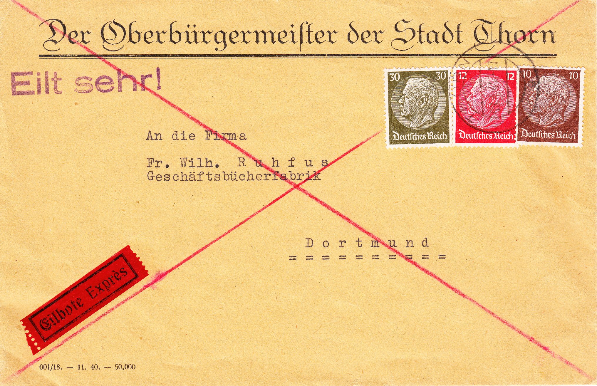 MiNr. 523 30 Pfennig dunkelbräunlicholiv Wasserzeichen Hakenkreuze in Mischfrankatur mit einem Wert zu 10 Pf sowie 12 Pf, am Dienstag, dem 08.04.1941 portogerecht auf Fernbrief (12 Pf) vom Oberbürgermeister der Stadt Thorn nach Dortmund per Eilzustellung (40 Pf):