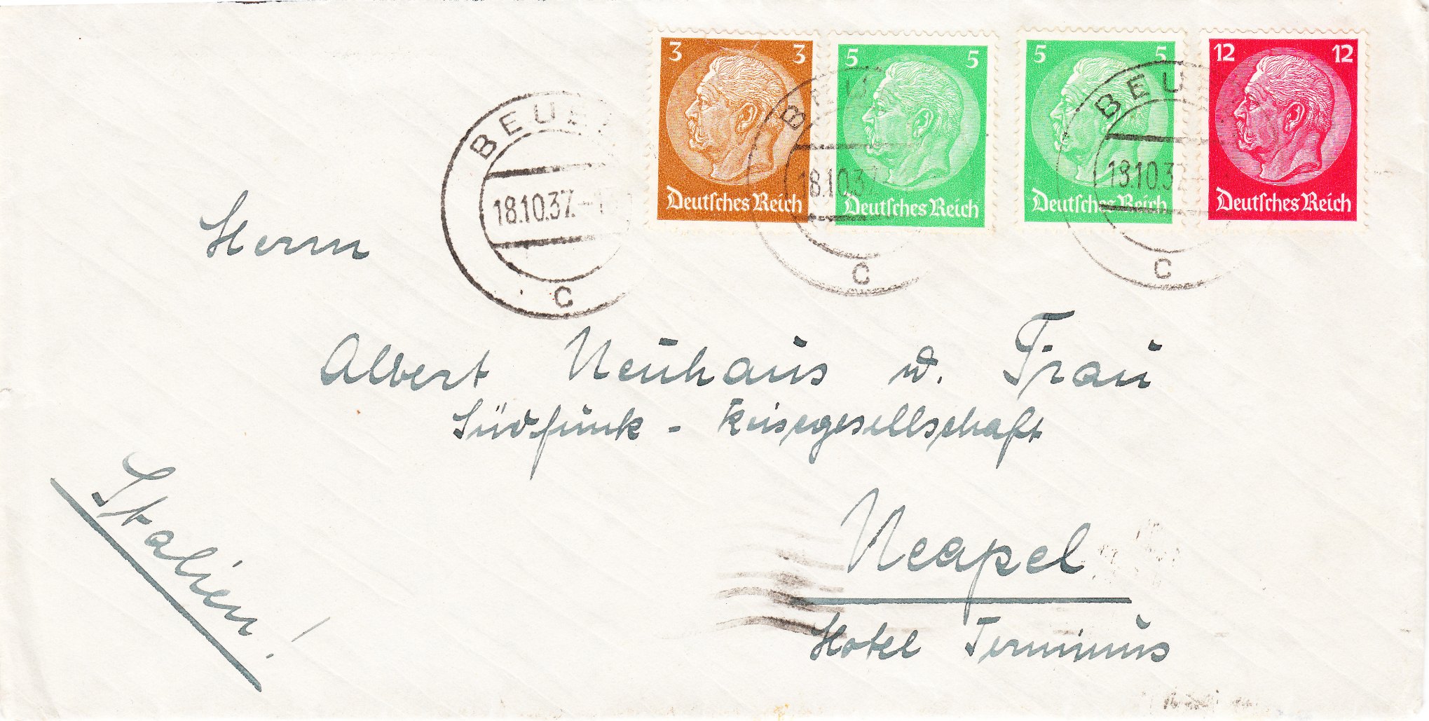 Der Brief kam am 20.10.1937 an seinem Bestimmungsort Neapel an, was rückseitig abgeschlagene Stempel dokumentieren: