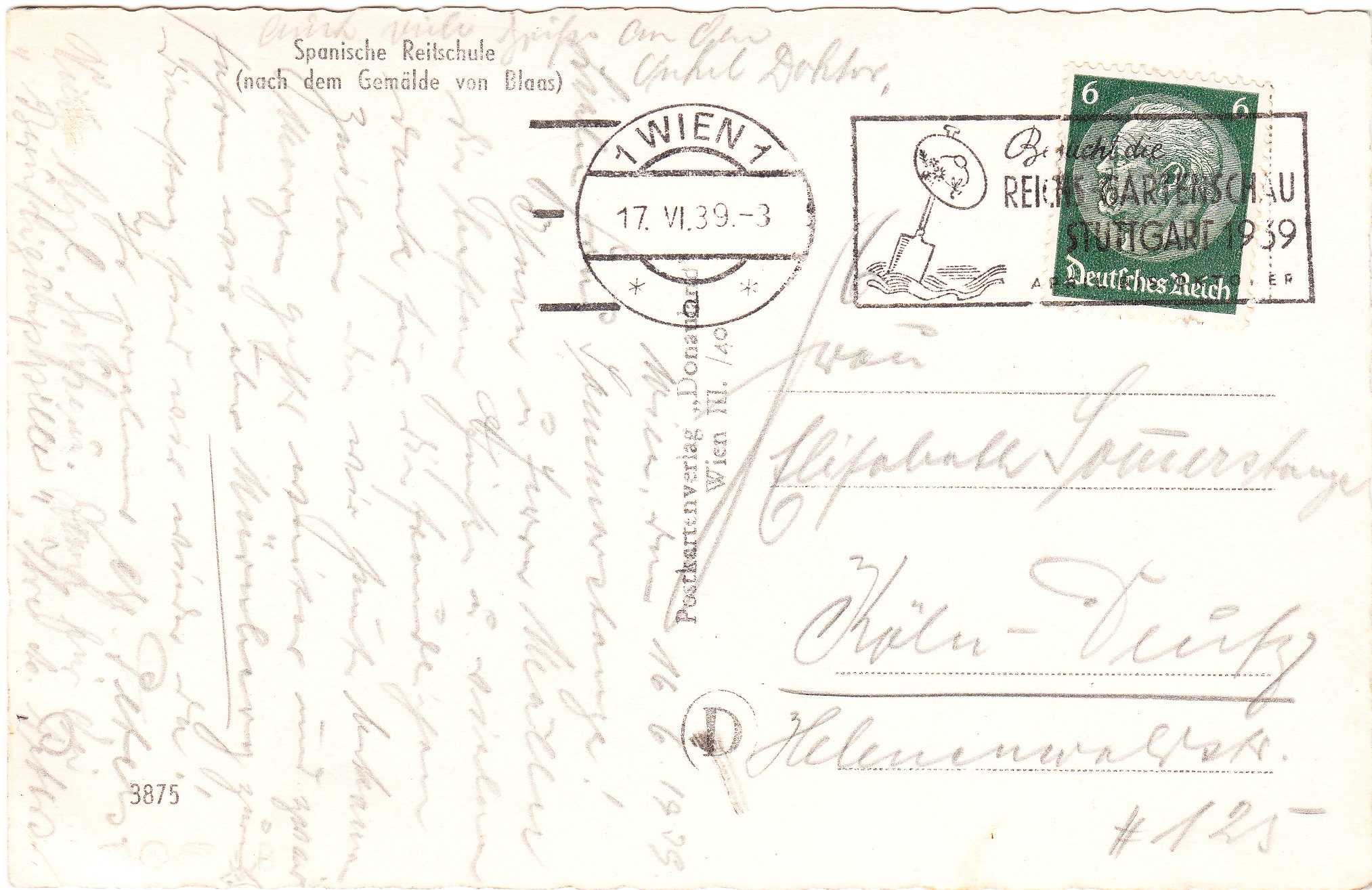 EF der MiNr. 516 am 17.06.1939 portorichtig auf Postkarte im Fernverkahr von Wien nach Köln gelaufen, entwertet per Maschinenstempel mit Werbeeinsatz zur Reichsgartenschau 1939 in Stuttgart: