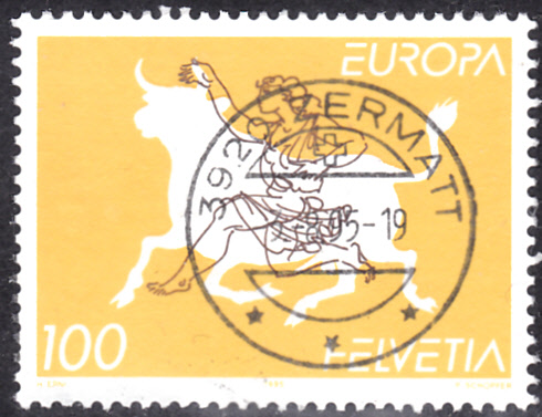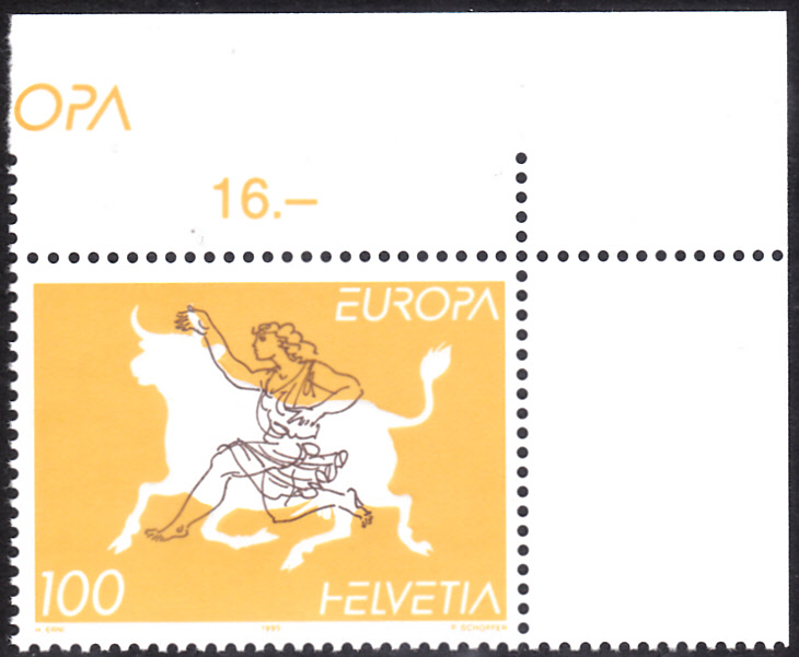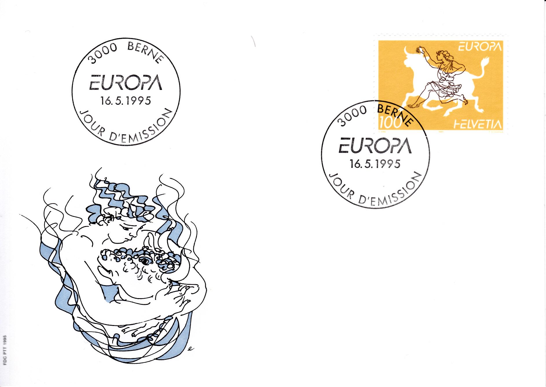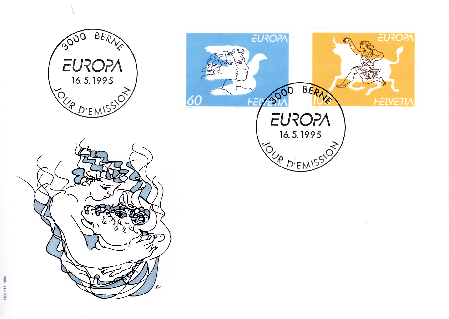 In der Schweiz erschienen die Europamarken 1995 am 16. Mai 1995 zum Gemeinschaftsthema "Frieden und Freiheit". Hier die Marke zu 100 Rappen mit der Abbildung "Zeus entführt als Stier die phönizsche Königstochter Europa". Die Auflage der Marke betrug 6 863 000 Stück.