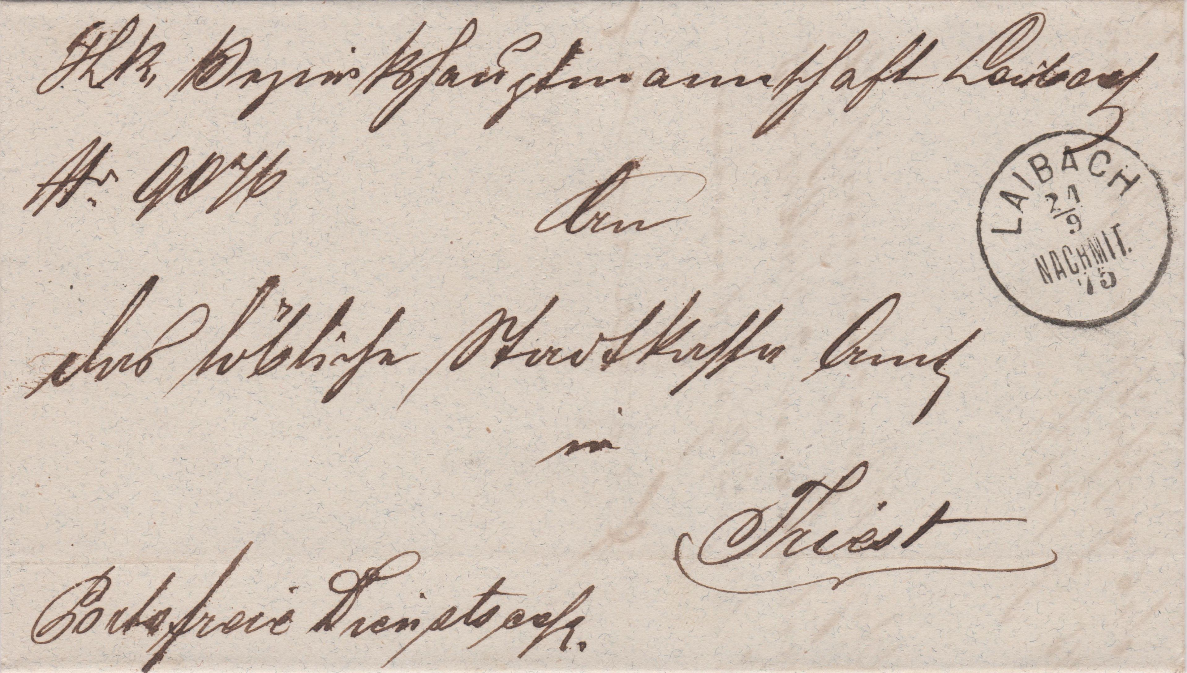 Hier eine "Portofreie Dienstsache", gelaufen am 21.09.1875 von Laibach nach Triest:
