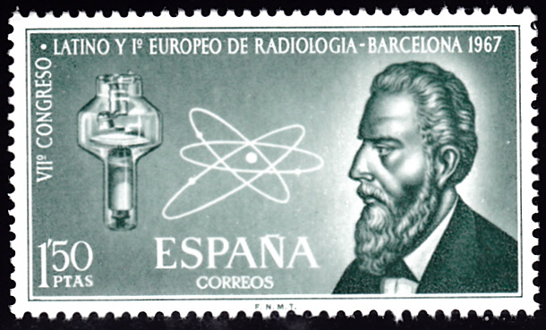Auf dieser Marke aus Spanien (MiNr 1676) zum Kongress für Radiologie in Barcelona sind Wilhelm Conrad Röntgen, eine Doppelfokus-Drehanoden-Röntgenröhre und ein Atommodell zu sehen.