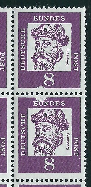 von der Ausgabe Bedeutende Deutsche kann ich hier einen Bogenteil der Marke zu 8 Pf (x-Papier) zeigen. Besonders auffällig ist dabei das senkrechte Paar in der rechten oberen Ecke. Hier handelt es sich um einen Farbausfall, der über 2 Marken geht. Das Papier ist von der Oberfläche nicht beschädigt, es war also keine Marke oder anderes daran festgeklebt. Über die Entstehung rätsel ich noch. Eventuell eine geplatzte Farbblase? Oder lag ein Fremdkörper darauf? Auf jeden Fall ist es eine schöne Druckzufälligkeit, welche einen Platz im Album verdient hat.
