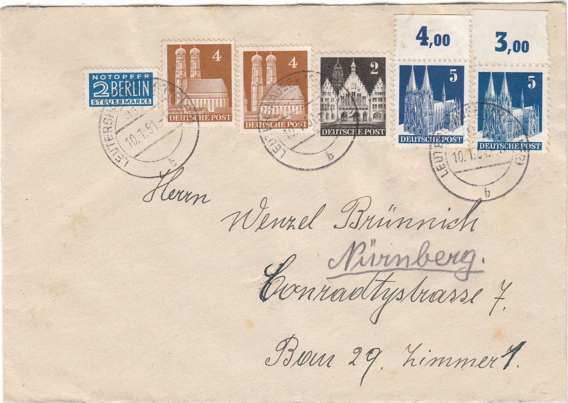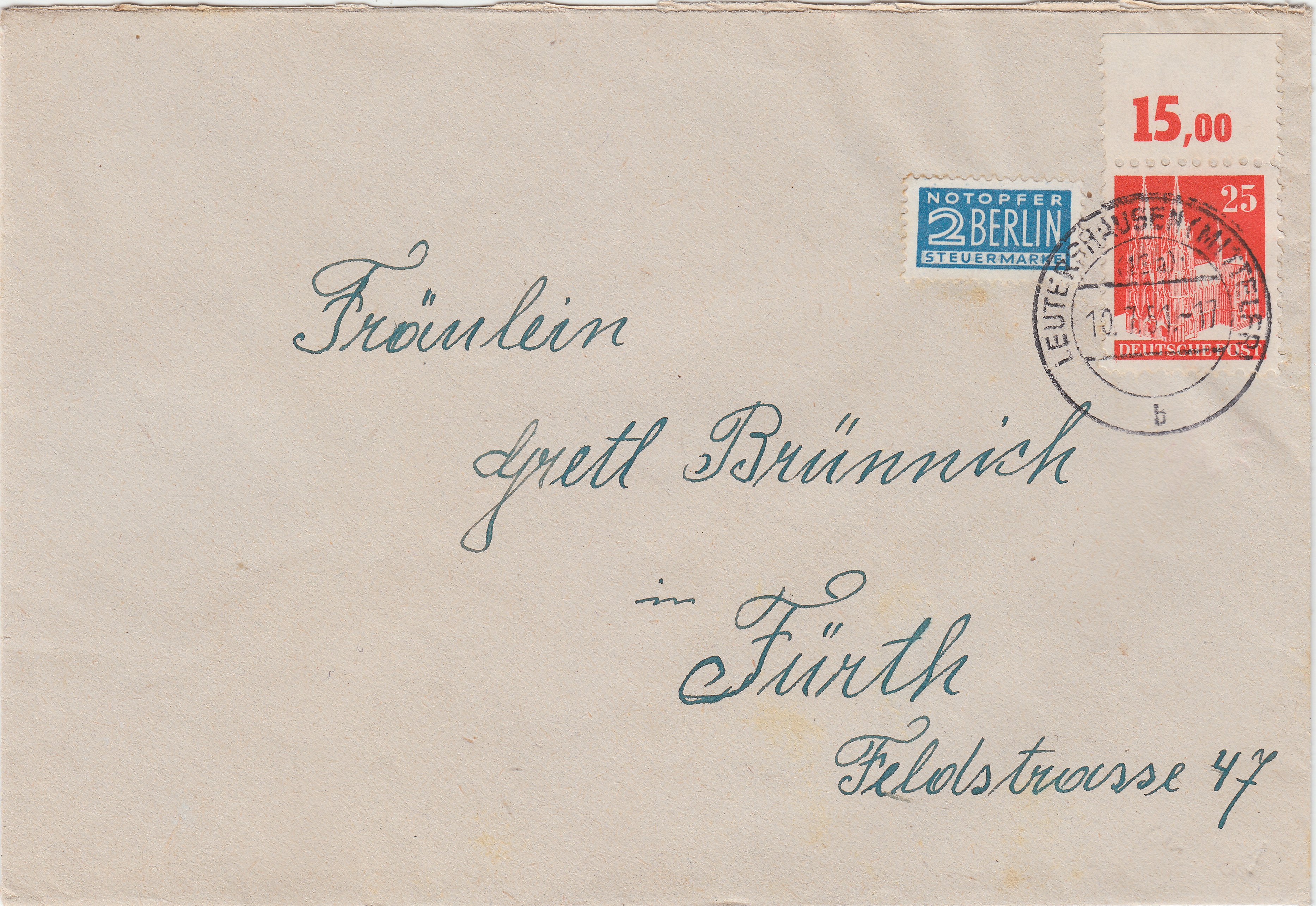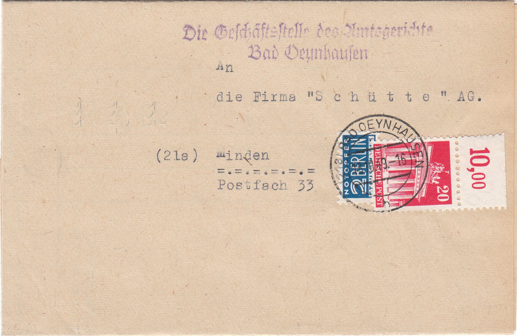 Der Oberrand Typ Bagel wurde bei diesem Exemplar abgetrennt und dazu verwendet, die Notopfermarke zu befestigen, die ohne Gummierung ist. Ich tippe daher relativ eindeutig auf eine Wiederverwendung einer bereits gebrauchten Zwangszuschlagsmarke zum Schaden der Post.