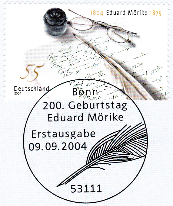 Der Ersttagsonderstempel aus Bonn zur Marke zum 200. Geburtstag von Eduard Mörike (MiNr 2419) zeigt einen Federkiel.