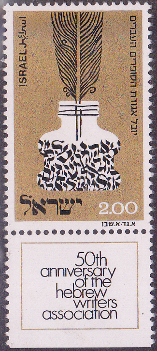 Eine Marke aus Israel (MiNr 607) zum Jubiläum "50 Jahre Hebräischer Schriftstellerverband in Israel" bildet ein Tintenfass mit Schreibfeder ab.
