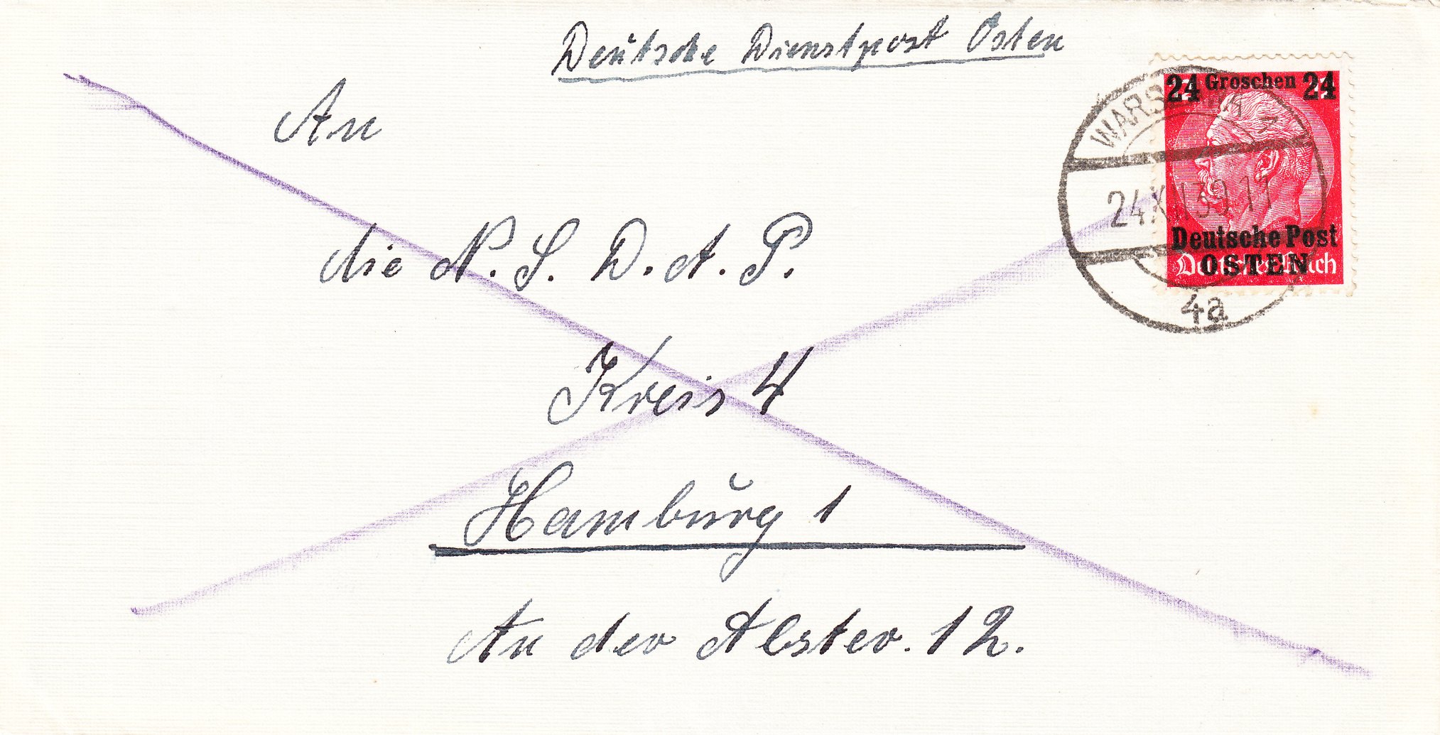 Hier als Beispiel ein Fernbrief, Porto 24 Groschen, aufgegeben am 24.12.1939 in WARSZAWA = Warschau, adressiert "An die N.S.D.A.P. Kreis 4" in Hamburg: