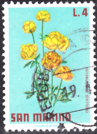 Aus San Marino kommt diese Marke (MiNr 987) mit einer Trollblume (Trollius europaeus).