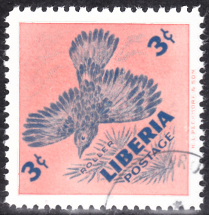 Auf dieser Marke aus Liberia (MiNr 451) ist vermutlich ein Zimtroller (Eurystomus glaucurus) zu sehen (möglicherweise auch ein Blaukehlroller (Eurystomus gularis)). Im Michel wird der Name mit Guinearacke (Eurystomus guineensis) angegebe. Nach längerem Suchen konnte ich weder etwas über den deutschen noch über den lateinischen Namen finden.