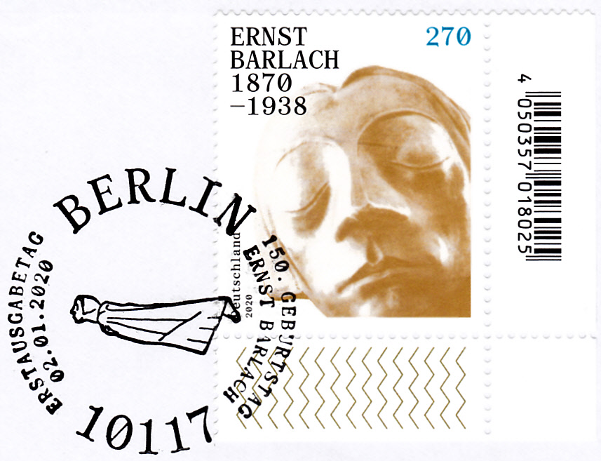 Brief mit der Marke zum 150. Geburtstag von Ernst Barlach (MiNr 3514) ,mit dem Ersttagsonderstempel aus Berlin. Der Stempel zeigt die Bronzeskulptur "Der Schwebende", die, wie schon beschrieben, die Gesichtszüge von Käthe Kollwitz hat.