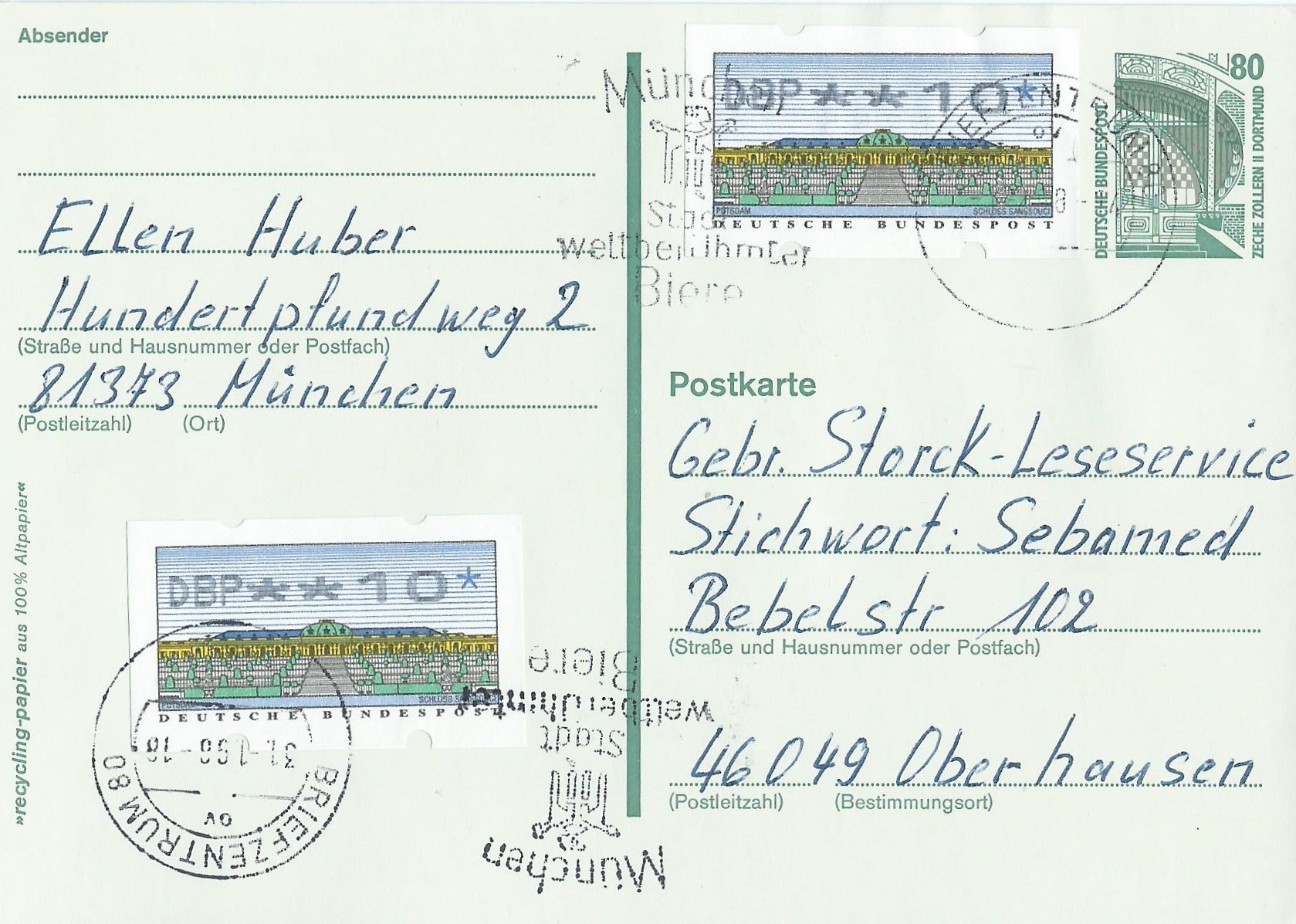 hier habe ich 2 Belege, bei denen ich selber noch am rätseln bin. Ich habe noch keine Erklärung gefunden, wie die jeweils zweiten Abschläge der Maschinenstempel in der Form auf die Umschläge gekommen sind. Technisch ist das eigentlich unmöglich, wenn man die Arbeitsweise einer Stempelmaschine kennt. Die stempelt nur immer die obere rechte Ecke der Briefe, wenn sie aufgestellt sind und eingezogen werden. Klar kann durch verkanten mal etwas schief stehen, aber so saubere Abschläge wie hier sind da normalerweise nicht machbar. Vielleicht hat ja noch jemand einen Lösungsvorschlag: