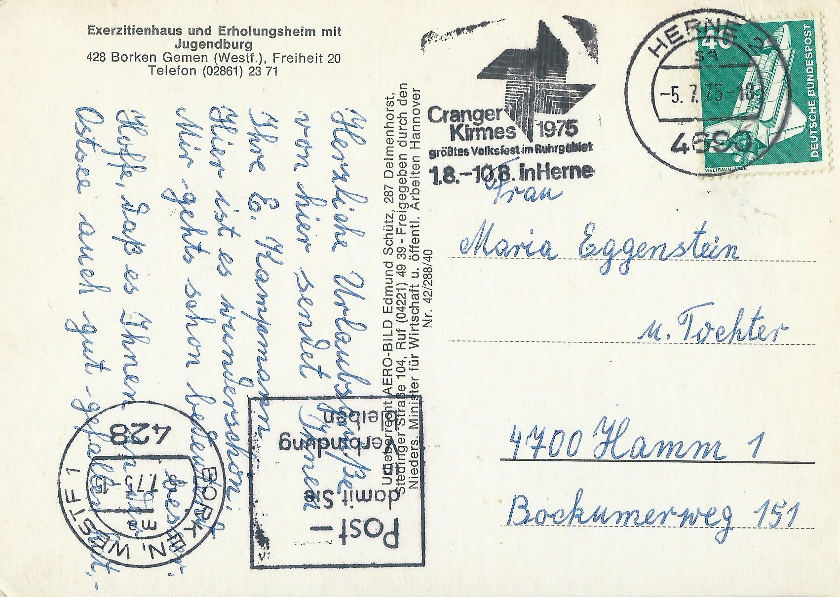 Der erste Beleg stammt aus St. Nikolaus, Saar und wurde am 6.12.75 abgestempelt. Hier ist ein zweiter Maschinenstempel links senkrecht angebracht worden.