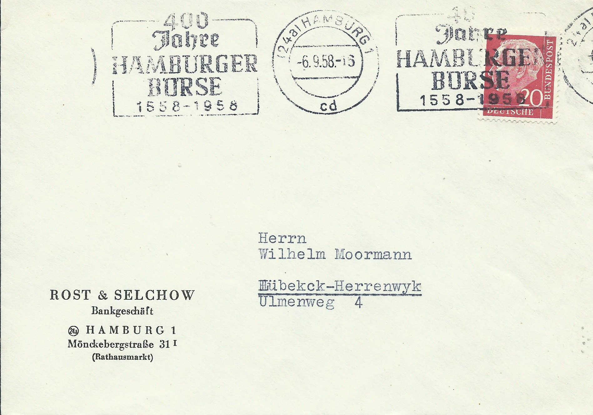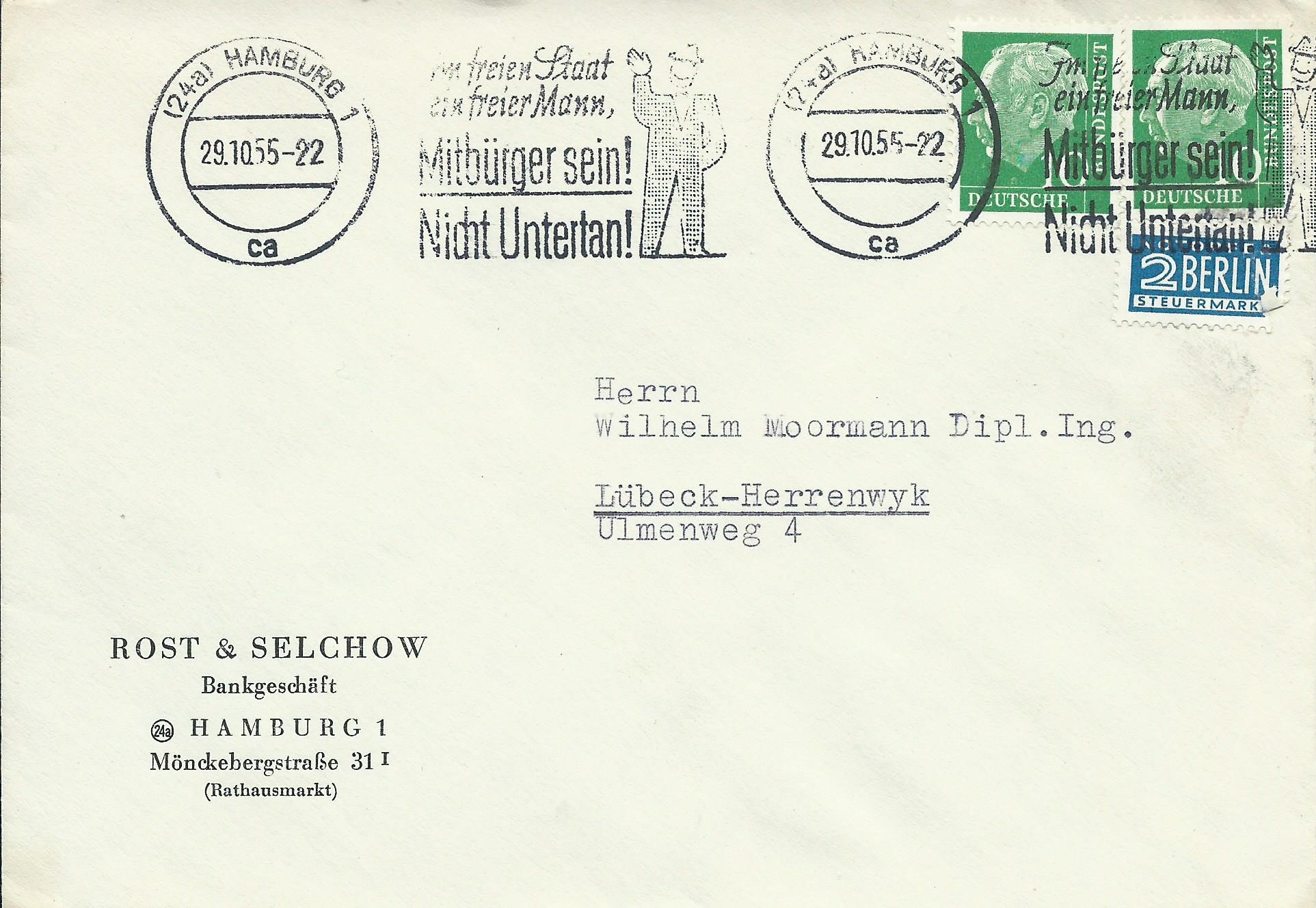 Ein weiser Spruch aus Lübeck am 14.1.63: Am Markenautomaten gewinnt man Zeit in Raten. Damit wollte man die Schalter entlasten, wenn die Kunden nur eine Briefmarke benötigten.