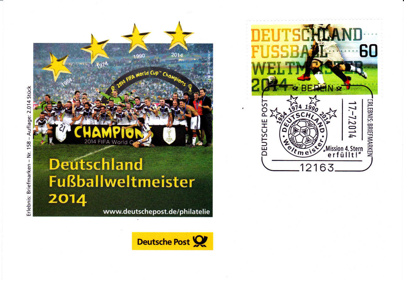 Am 17.07.2014 verausgabte die Deutsche Post AG eine Sondermarke zum Gewinn der Fußball-Weltmeisterschaft durch die Deutsche Mannschaft. In Berlin gab es dazu einen Stempel "Mission 4.Stern erfüllt" und einen Ersttagsbrief, der von den EB-Teams verkauft wurde, in einer Auflage von 2014 Stück.