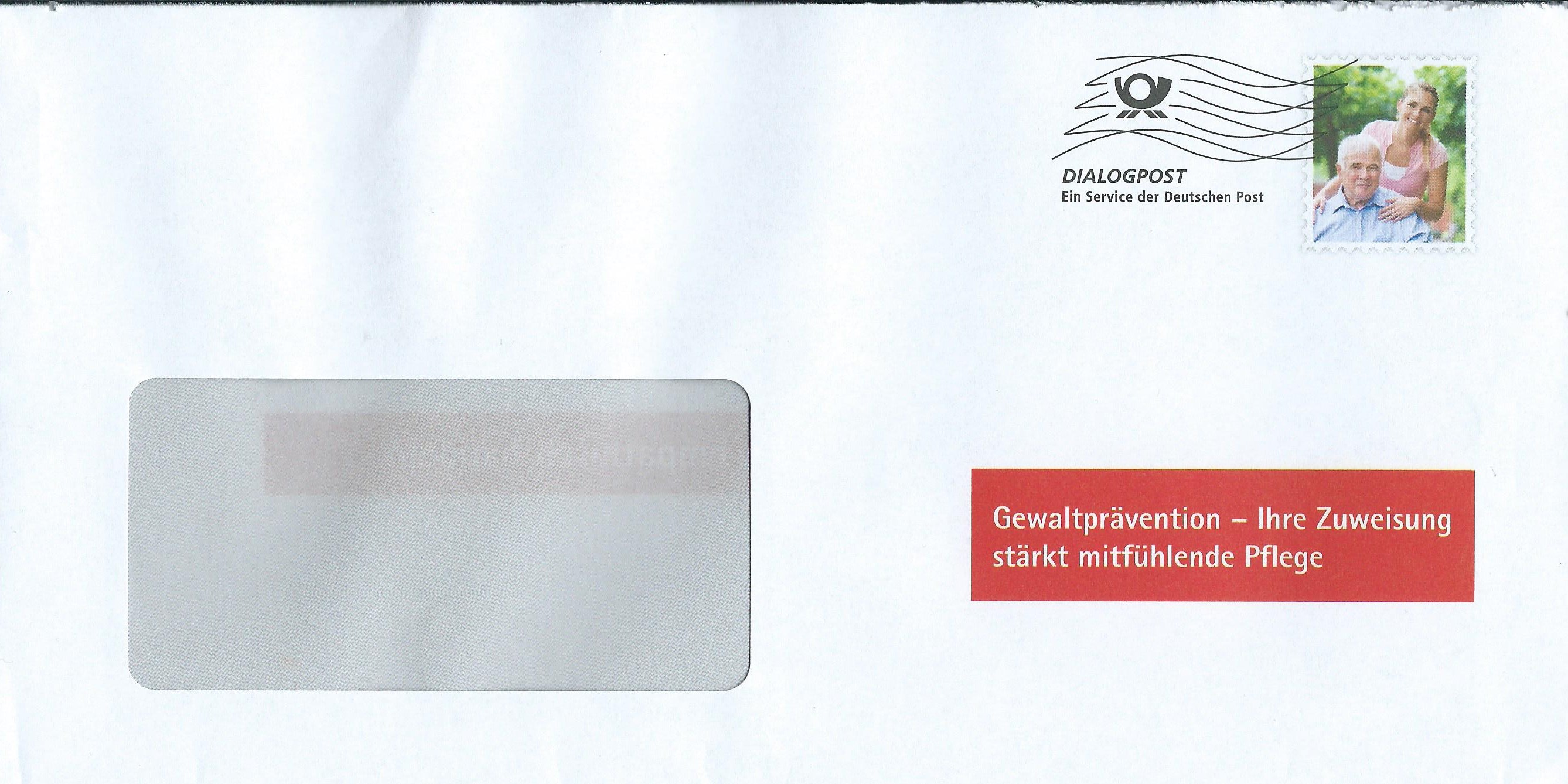 Der zweite hat keinen richtigen Absender auf dem Umschlag, weist aber auf das Thema Gewaltprävention hin. Er hat neben der Frankierwelle noch einen markenähnlichen Zudruck zweier Personen im Grünen.