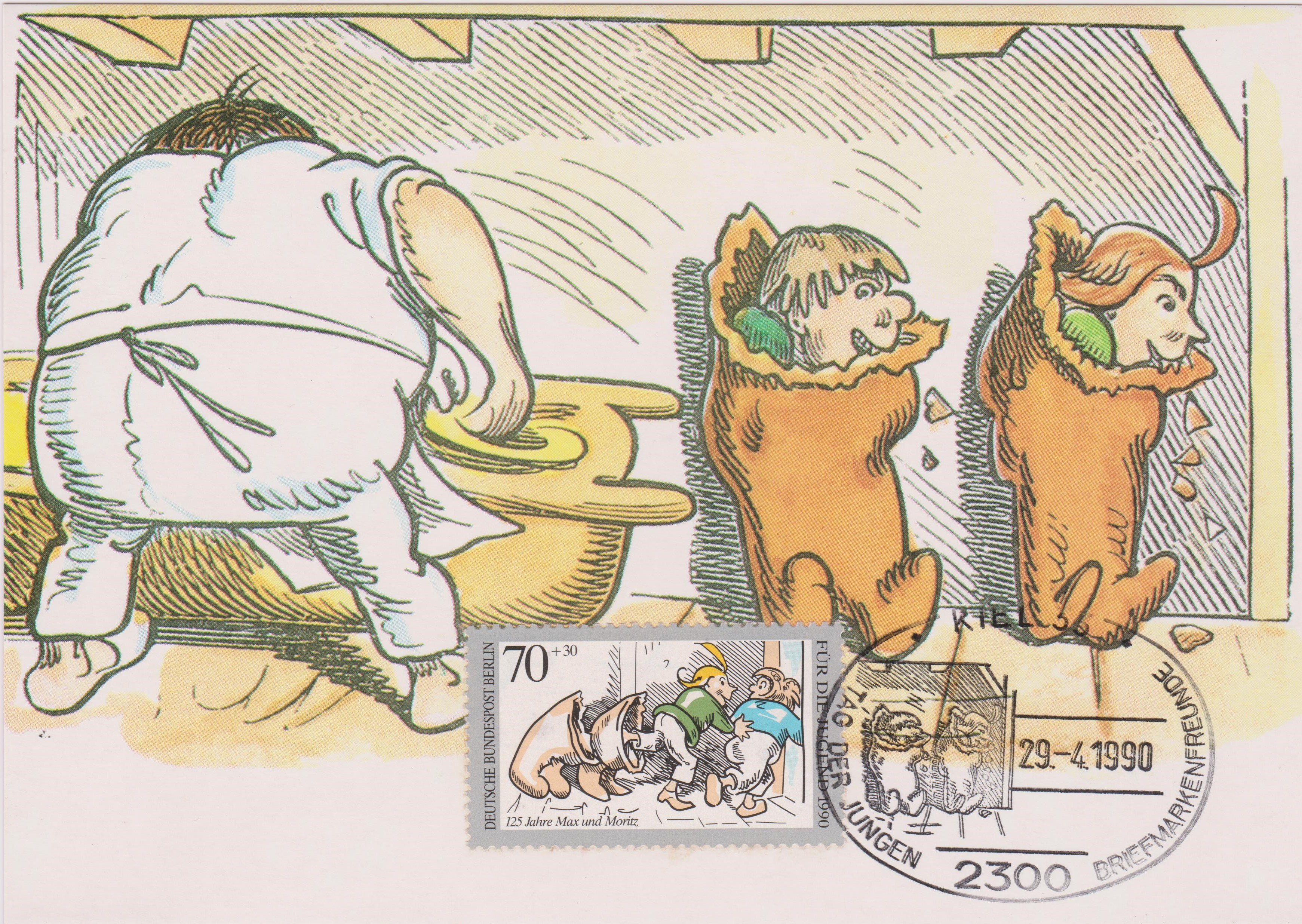 Maximumkarte "DEUTSCHE BUNDESPOST BERLIN, FÜR DIE JUGEND 1990, 175 Jahre Max und Moritz" mit thematisch exakt passendem Sonderstempel aus KIEL: