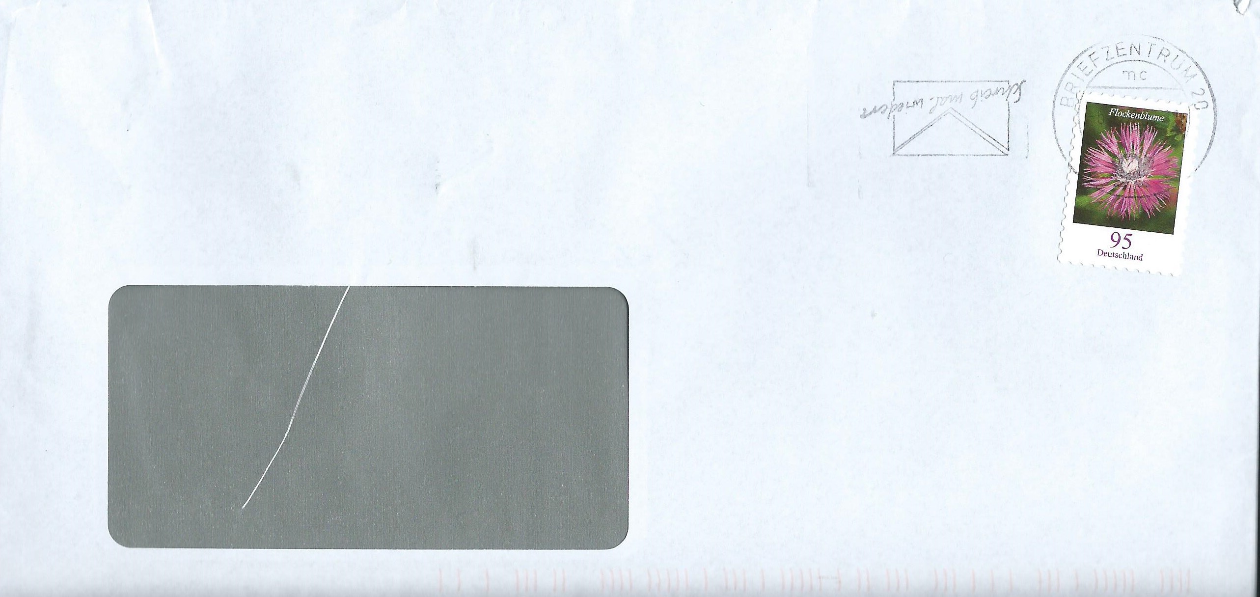 Der nächste Beleg mit einer nassklebenden Blumenmarke zu 95 Cent war ein Opfer von Sturmtief Sabine. Er hat doch etwas unter den Regenmassen gelitten, oder ist er eventuell am 10.2.20 am Hamburger Fischmarkt bei Sturmflut in den Briefkasten geworfen worden?