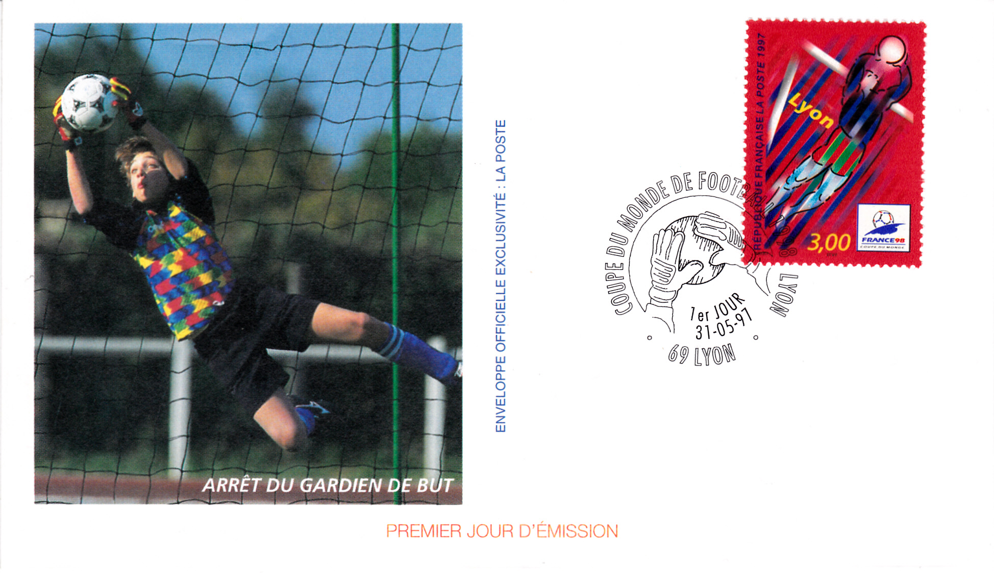 1997 erschien in Frankreich eine weitere Serie zur Fußball-WM 1998. Auf dieser Marke (MiNr 3218) ist ein Torhüter beim Fangen eines Balles abgebildet. Die Marke dokumentiert auch den Spielort Lyon.