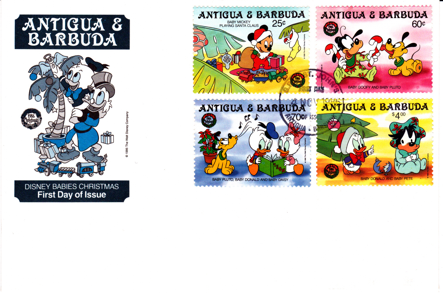 Pluto, Daisy Duck, Donald Duck (alle drei als Baby) singen auf der Marke zu Weihnachten 1986 aus Antigua und Barbados (MiNr 999) zusammen Weihnachtslieder.