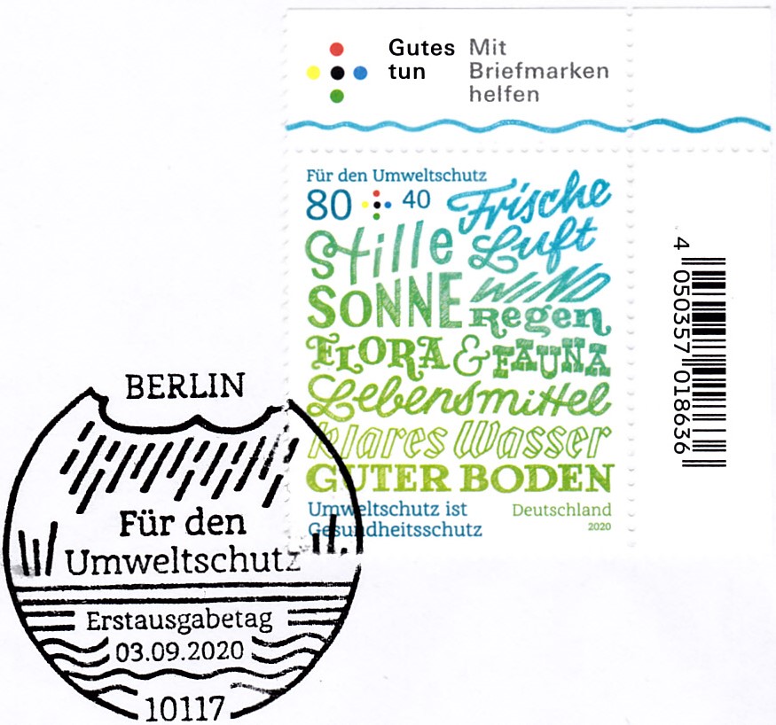 Die Marke 2020 der Deutschen Post steht (MiNr 3561) unter dem Motto "Umweltschutz ist Gesundheitsschutz und zeigt Schlagworte zu Umweltschutz und gesundem Leben. Ich zeige hier ein Eckrandstück mit EAN-Codierung.