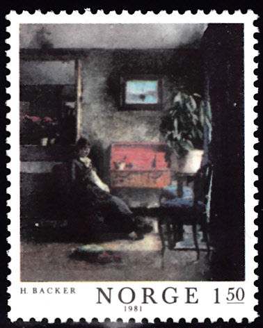 in der Ausgabe "Klassiker der norwegischen Malerei" erschien in Norwegen auch eine Marke (MiNr 847) mit dem Gemälde "Blått Interior" ("Interieur in Blau") von Harriet Backer. Das Ölgemälde aus dem Jahre 1883 befindet sich in der Norwegischen Nationalgalerie.