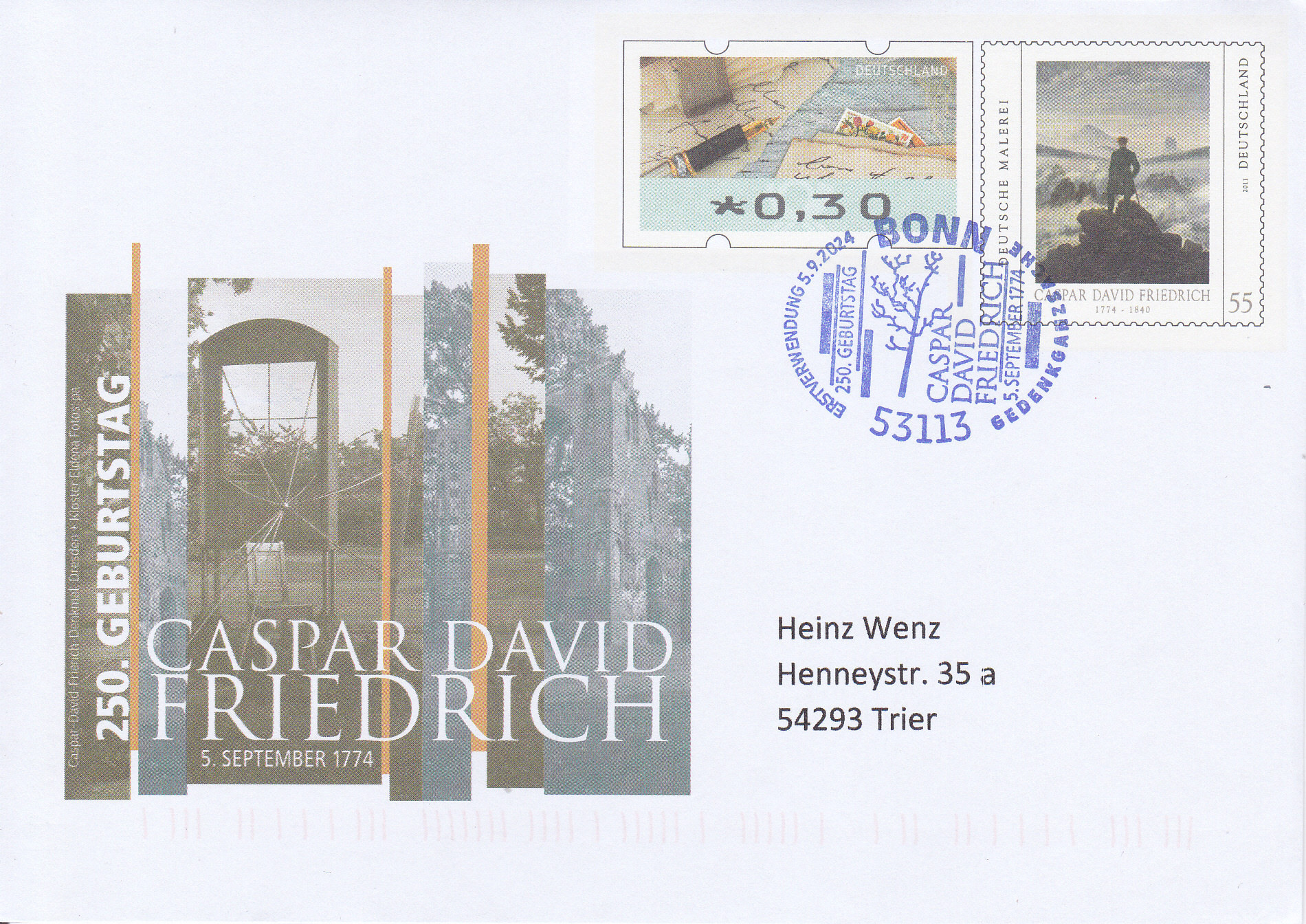 Dieser Gedenkumschlag zum 275. Geburtstag von Caspar David Friedrich wurde mit dem Erstverwendungsstempel Bonn gestempelt.