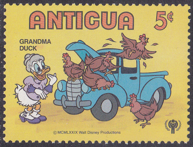 In einer Serie zum Internationalen Jahr des Kindes ist 1981 in Antigua und Barbuda diese Marke (MiNr 568) mit Oma Duck als Autofahrer erschienen. Ob sie die Hühner locken oder verscheuchen will?