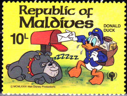 Auf den Malediven erschien am 10.12.1979 eine Serie zum Internationalen Jahr des Kindes mit Walt-Disney-Figuren. Auf diesem Wert (MiNr 853) stellt Donald Duck einen Brief in einen von einer Bulldogge "bewachten" Briefkasten zu.