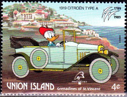 In St. Vincent Grenadinen, Union Island erschien am 7. Juli 1989 zum 200. Jahrestag der Französischen Revolution und zur Internationalen Briefmarkenausstellung PHILEXFRANCE ’89 in Paris eine Serie mit Walt-Disney-Figuren in historischen Automobilen. Union Island ist mit 8 km² eine der südlichsten Inseln der Grenadinen und Teil des Staates St. Vincent und die Grenadinen. Auf der Insel leben ca. 5.000 Einwohner.