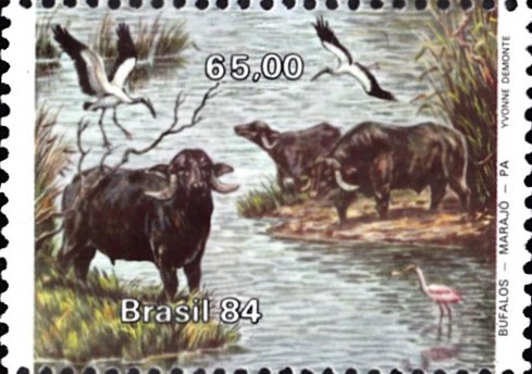 Auf einer Marke aus Brasilien (MiNr 2054) sind drei Wasserbüffel (Bubalus arnee) auf der Insel Marajó abgebildet.