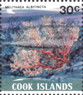 Auf dieser Marke der Cook-Inseln (MiNr 735) sehen wir eine Melithaea albitincta.