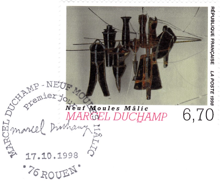 Der Ersttagsonderstempel aus Rouen zu dieser Marke zeigt eine Unterschrift von Marcel Duchamp.
