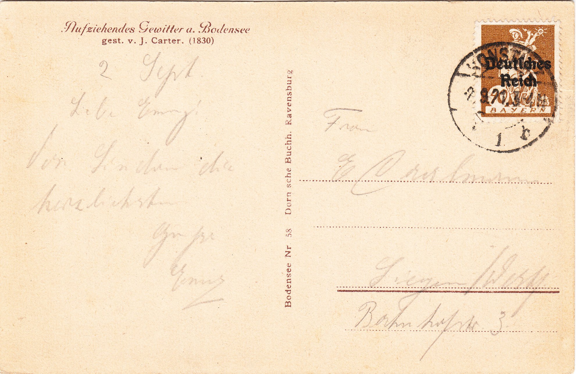 Hier ein nach links dezentriertes Exemplar der Wertstufe 15 Pfennig, MiNr. 121, im Juni 1920 als Fernpostkarte portorichtig als Zusatzfrankatur auf einem Postkartenvordruck mit dem Eindruck eines entsprechenden Wertstempels aus Bayern, ebenfalls mit Aufdruck "Deutsches Reich":
