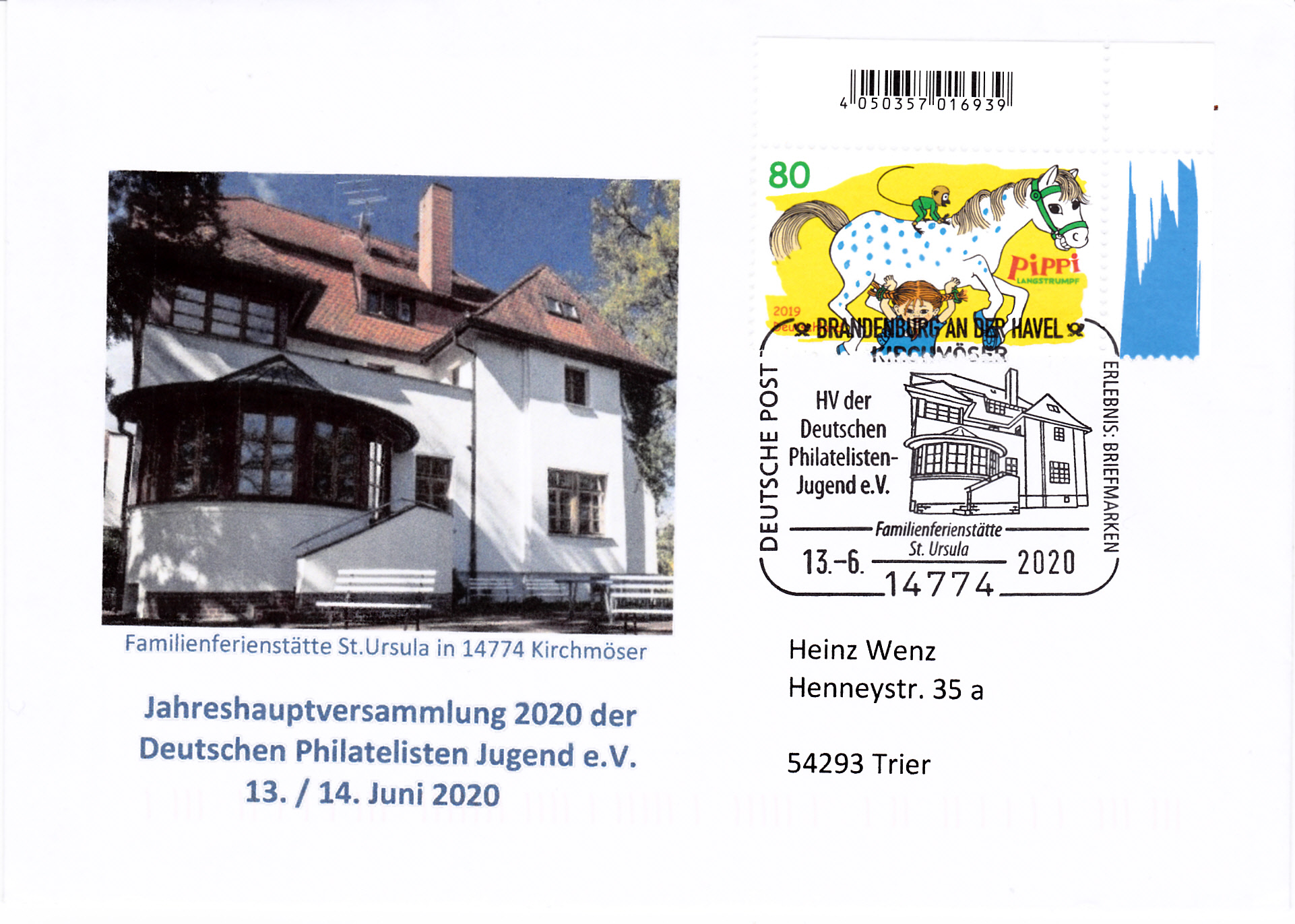 Zur Hauptversammlung der DPhJ in Brandenburg an der Havel wurde bei einer Sonderpostfiliale ein Sonderstempel mit der Abbildung der Familienferienstätte St. Ursula in Kirchmöser (Ortsteil von Brandenburg) eingesetzt.