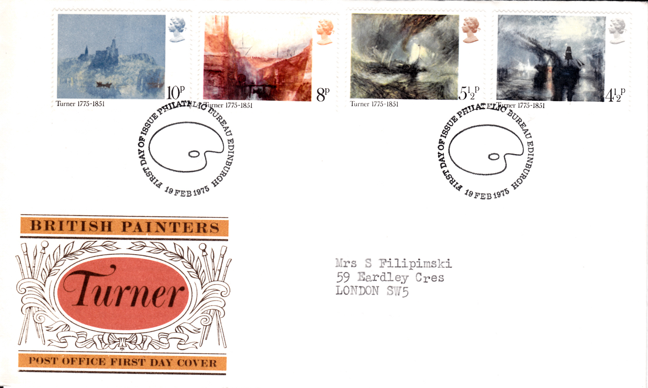 Zum 200. Geburtstag von William Turner ist in Großbritannien eine Markenserie erschienen. Auf der Marke zu 4 1/2 Pence (MiNr 669) ist das Gemälde "Frieden - Bestattung auf See" von William Turner zu sehen.