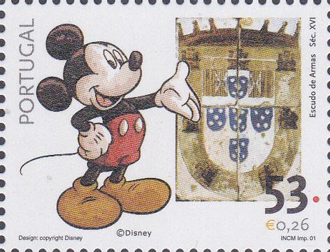 In der Serie "100. Geburtstag von Walt Disney" aus Portugal werden Walt-Disney-Figuren und Azulejos abgebildet. Hier eine der Marken (MiNr 2542) mit Micky Maus.