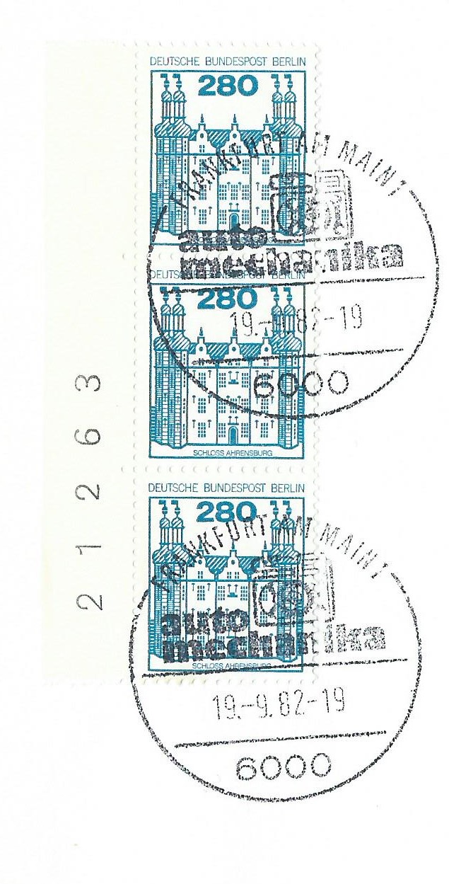 Der Wert zu 280 Pf vom linken Bogenrand als senkrechter 3-er-Streifen mit Bogenzählnummer auf einem Briefausschnitt, gestempelt mit einem Sonderstempel von Frankfurt am Main vom 22.3.81: