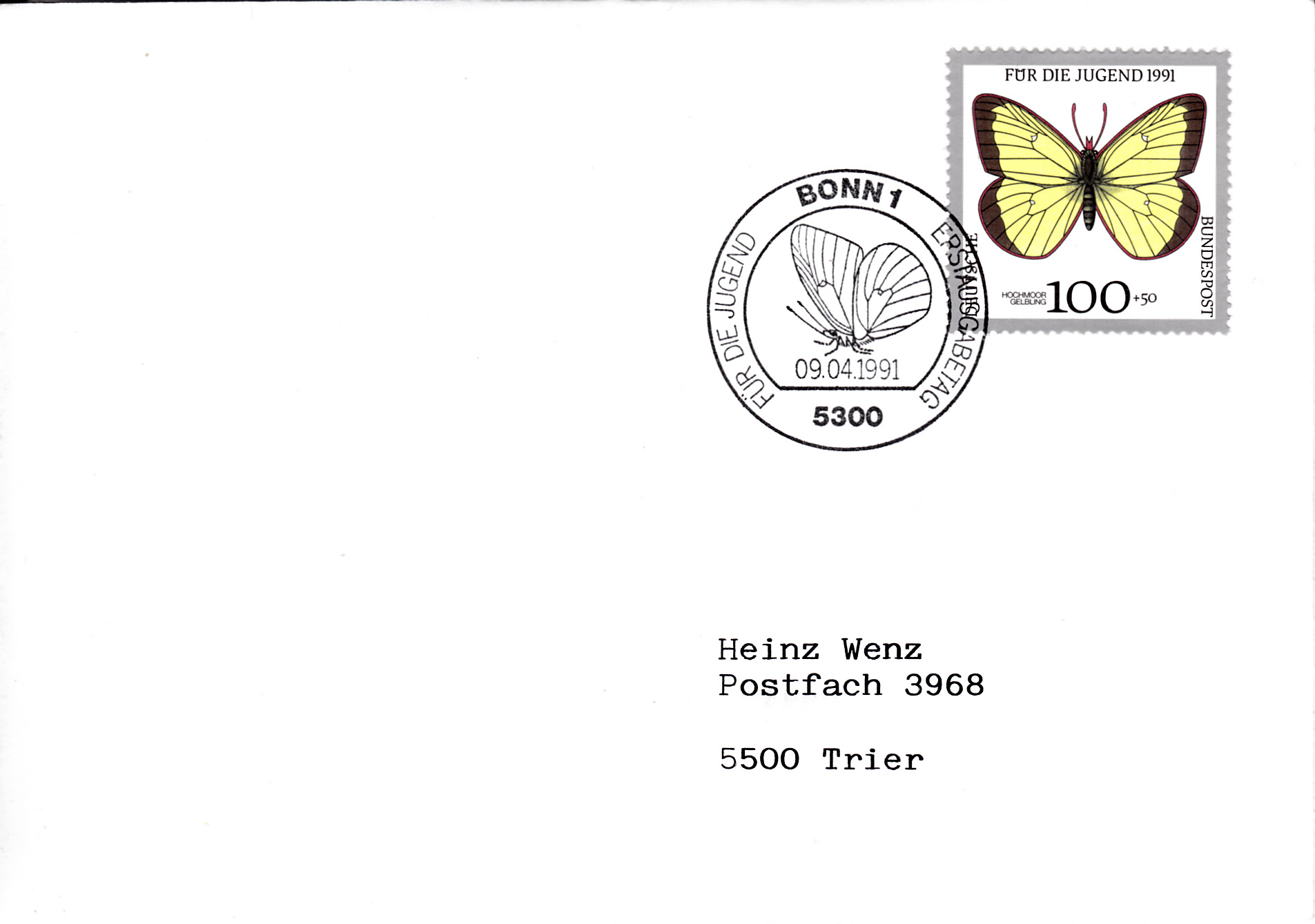 Die bereits gezeigte Marke aus der Jugendmarkenserie 1991 (MiNr 1518) mit dem Hochmoorgelbling oder Zitronengelben Heufalter(Colias palaeno) ist auf diesem Brief mit dem Ersttagsonderstempel Bonn entwertet worden.