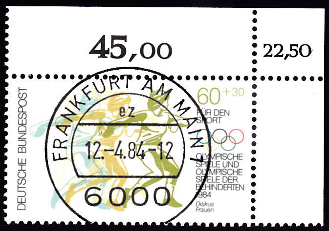 Die hier schon gezeigten Marken der Deutschen Bundespost zu den Sommerspielen 1984 zeige ich hier noch als von der Versandstelle gelieferte "gestempelte" Marke vom rechten oberen Eckrand. Auf dem Bogenrand befindet sich ein korrigierter Bogenwertzudruck (KBWZ). Da die Marken bogenweise mittels Druckmaschinen entwertet wurden, wurden bei der Entwertung des kompletten Bogens eine bzw. mehrere anhängende Marken durch kleine Stempelsegmente unverkäuflich und der Verkaufswert war geringer und dieser wurde auf den Bogenrand gedruckt.