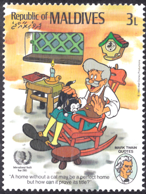 Auf einer Marke der Malediven (MiNr 1179) zum 150. Geburtstag von Mark Twain und zum Internationalen Jahr der Jugend