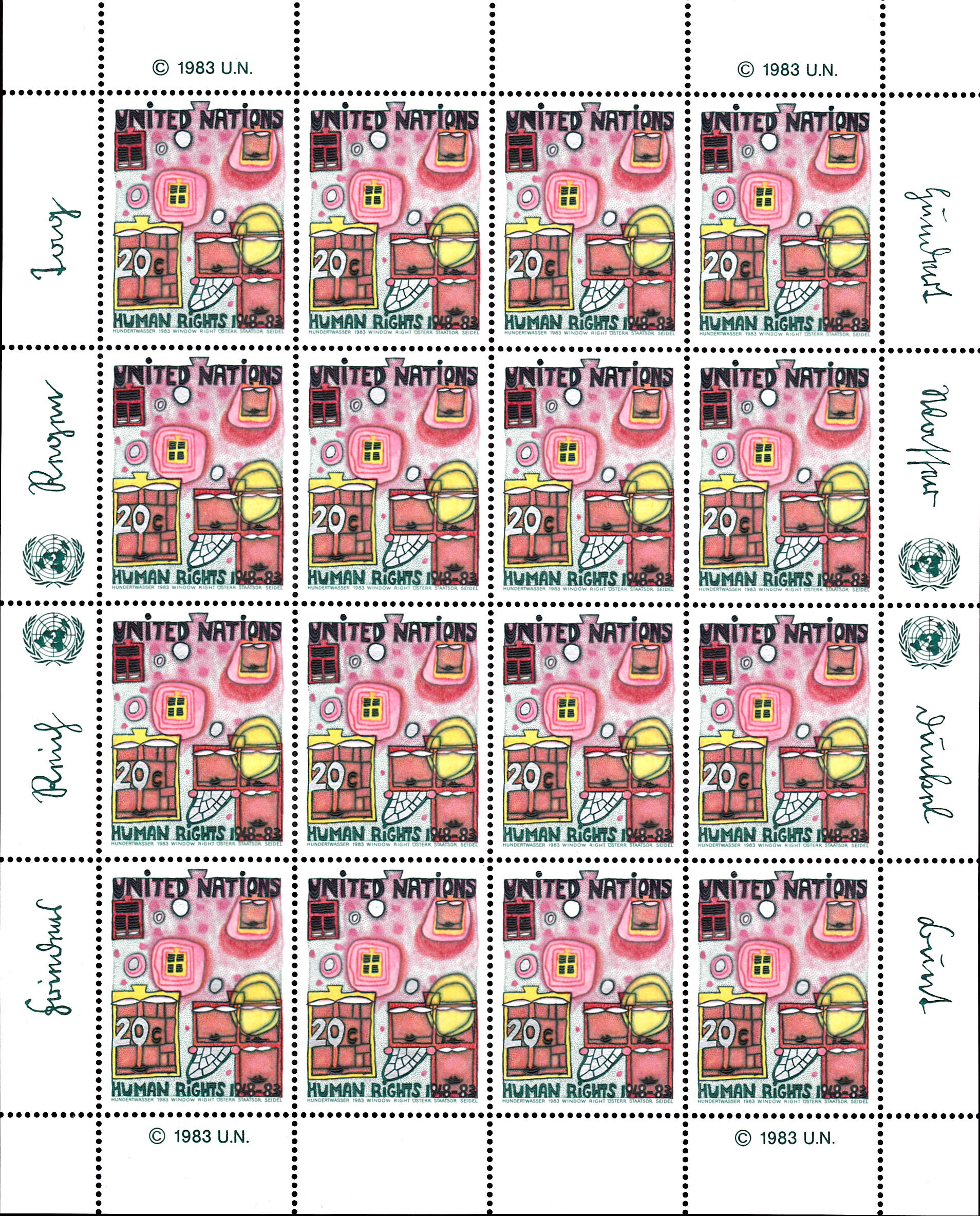 Auch die beiden hier schon früher gezeigten Marken der UNB-Postverwaltung Genf wurden in Bögen zu je 16 Marken gedruckt. Sie zeigen ebenfalls den von Hundertwasser selbst gewählten vollständigen Name Friedensreich Hundertwasser Regentag Dunkelbunt.