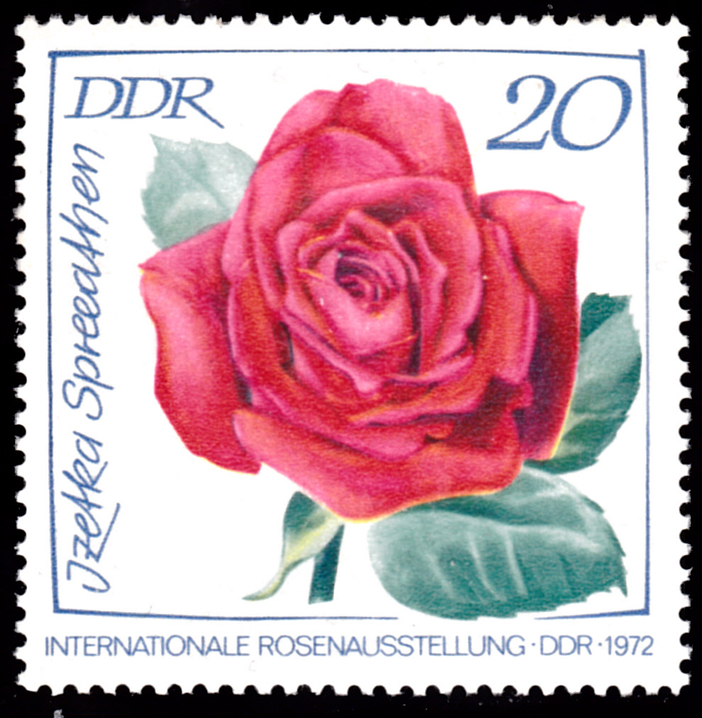 Zur Internationalen Rosenausstellung in Erfurt sind in der DDR in einer Serie Marken mit Rosenabbildungen erschienen. Hier zeige ich die Marke zu 5Pf (MiNr 1763) mit der Teehybride mit dem Namen Karneol-Rose.