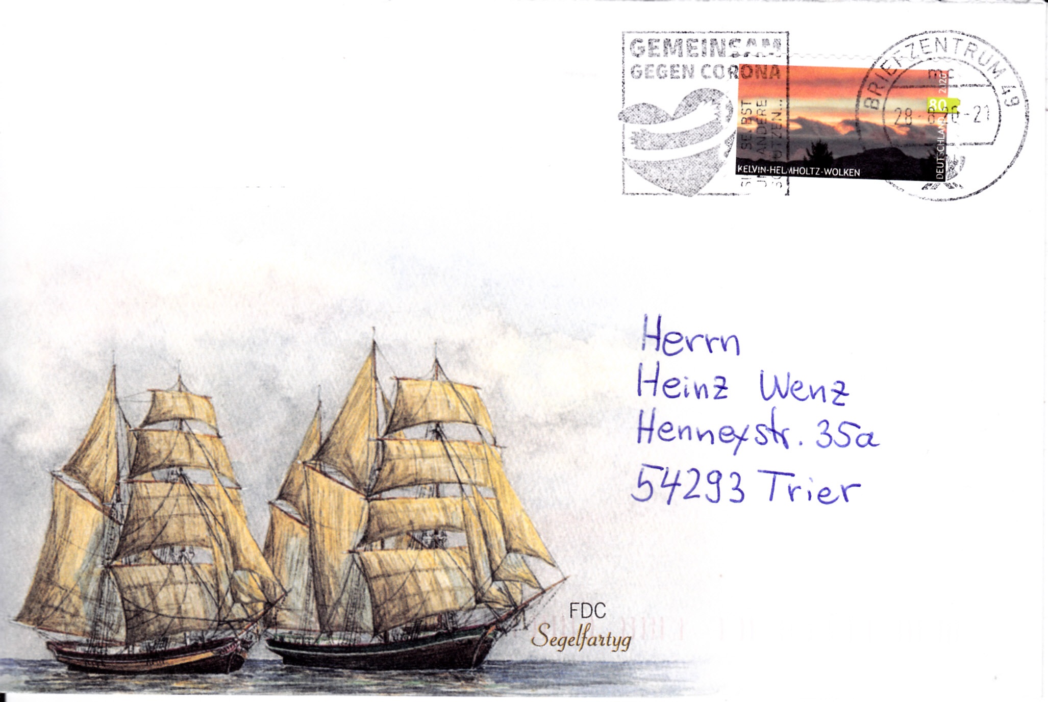 Dieser Brief wurde am 21.9.2020 im Briefzentrum 10 mit dem Einsatz "Gemeinsam gegen Corona" gestempelt.