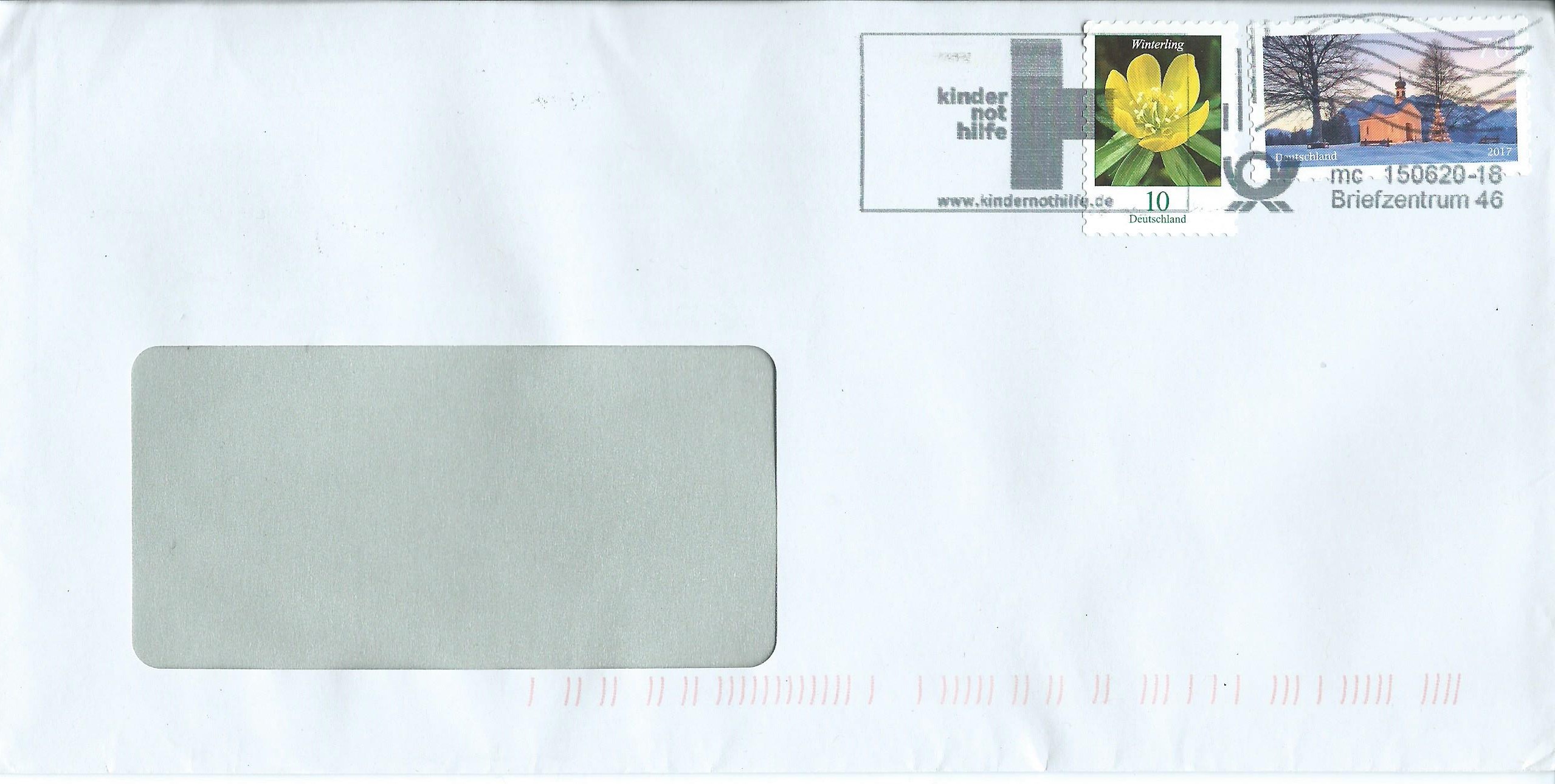 mir sind einige neue Belege mit den neuen Tintenstrahl-Entwertungen in die Hände gekommen, die hier gleich gezeigt werden sollen. Den Anfang macht ein Brief aus dem Briefzentrum 46 vom 15.6.20 mit dem Werbezusatz der Kinder-Nothilfe.