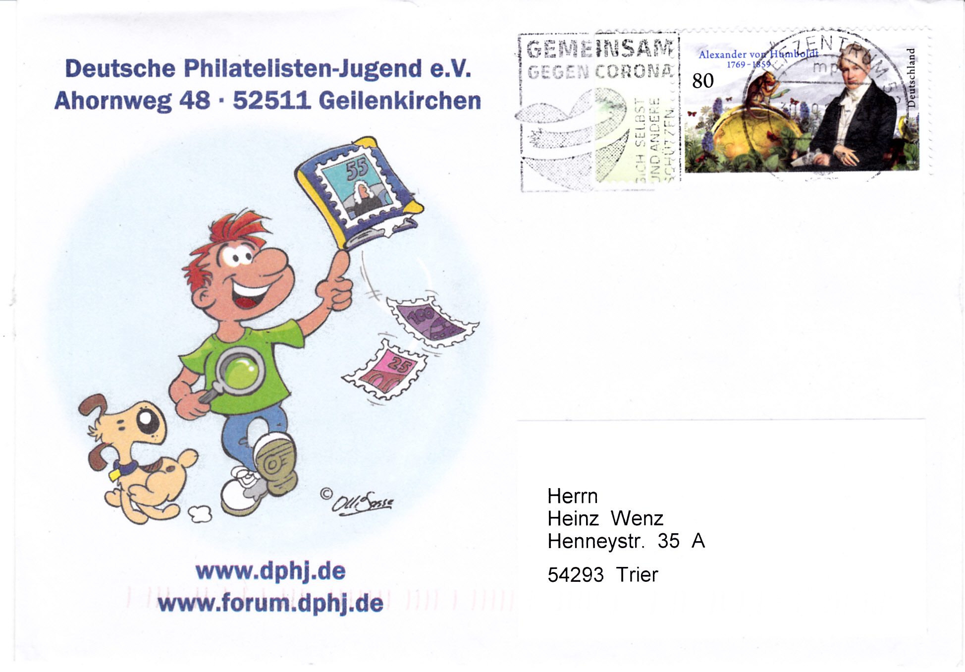 Am 9.10.2020 wurde dieser Brief um Briefzentrum 01 mit dem Einsatz "Gemeinsam gegen Corona" gestempelt.