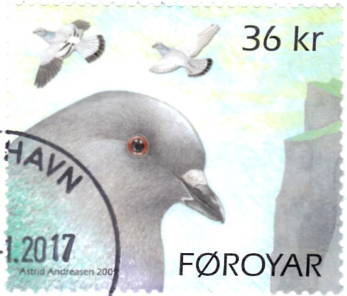 In Dänemark Färöer ist diese Marke mit dem Kopf einer Felsentaube (Columba livia) und zwei fliegenden Felsentauben (Columba livia) erschienen.